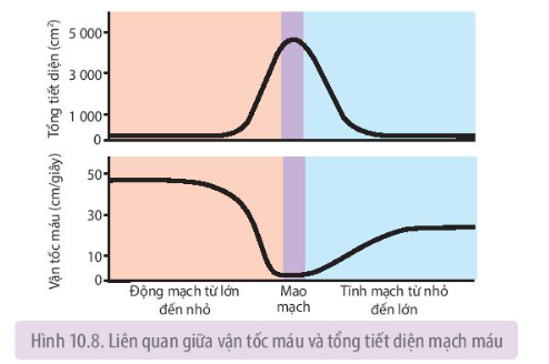 a) Vận tốc máu giảm dần từ động mạch đến mao mạch và tăng dần từ mao mạch đến tính mạch. Tổng tiết diện của mao mạhc > Tổng tiết diện của tĩnh mạch > Tổng tiết diện của động mạch.