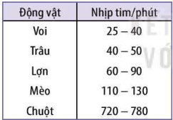 Bảng dưới đây cho thấy nhịp tim của một số động vật:
