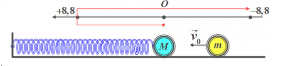 Một con lắc lò xo, lò xo có khối lượng không đáng kể, độ cứng $100 (N/m)$, vật nặng $M=300 (g)$ có thể trượt không masát trên mặt phẳng nằm ngang. Hệ đang ở trạng thái cân bằng, dùng một vật $m = 200 (g)$ bắn vào M theo phương nằm ngang với vận tốc $2 (m/s)$. Va chạm là hoàn toàn đàn hồi. Sau khi va chạm, vật M dao động điều hòa theo phương ngang. Gốc tọa độ là điểm cân bằng, gốc thời gian là ngay lúc sau va chạm, chiều dương là chiều lúc bắt đầu dao động. Tính khoảng thời gian ngắn nhất vật có li độ $- 8,8 cm$
