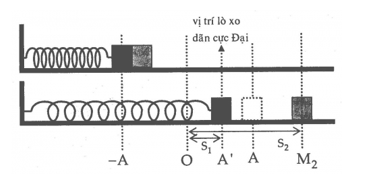 + m1 dao động điều hòa với tần số góc \(\omega ‘ = \sqrt {\frac{k}{{{m_1}}}} \) và biên độ \(A’ = \frac{{{v_0}}}{{\omega ‘}} = A\sqrt {\frac{{{m_1}}}{{{m_1} + {m_2}}}} \) (vì tốc độ cực đại không đổi vẫn là v0)