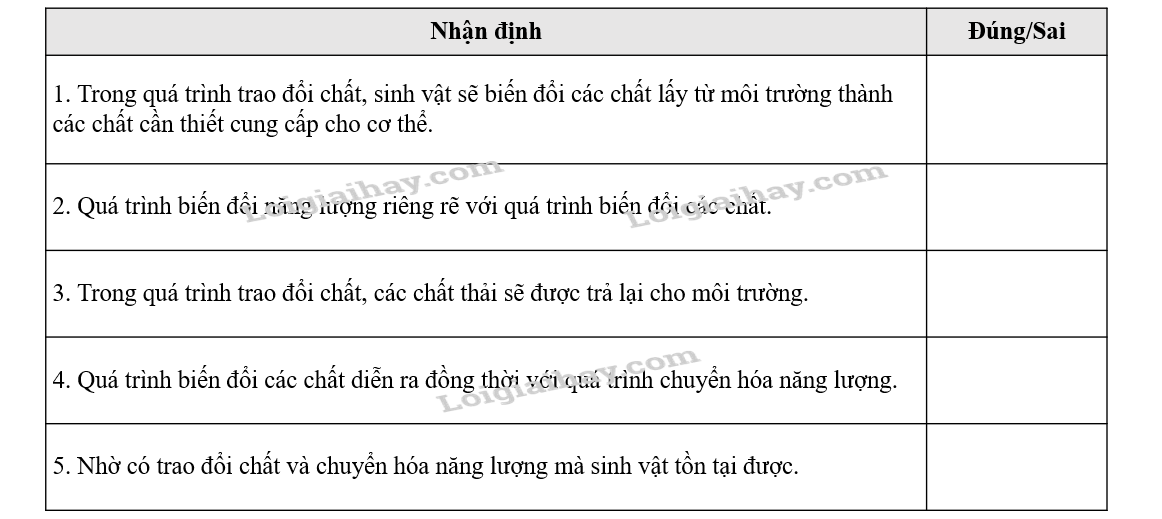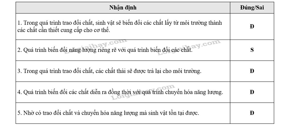 Xác định tính đúng, sai của các nhận định trong bảng sau bằng cách ghi từ Đúng hoặc Sai vào ô bên cạnh.