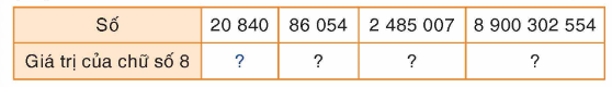 – Chữ số 8 trong số 8 900 302 554 thuộc hàng nghìn tỉ nên có giá trị là 8 000 000 000