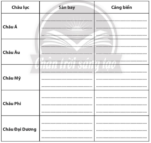 Dựa vào hình 34.2 trong SGK, em hãy kể tên một số sân bay, các cảng biến lớn ở các châu lục