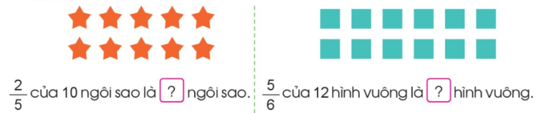$\frac{5}{6}$ của 12 hình vuông là: $12 \times \frac{5}{6} = 10$ (ngôi sao)
