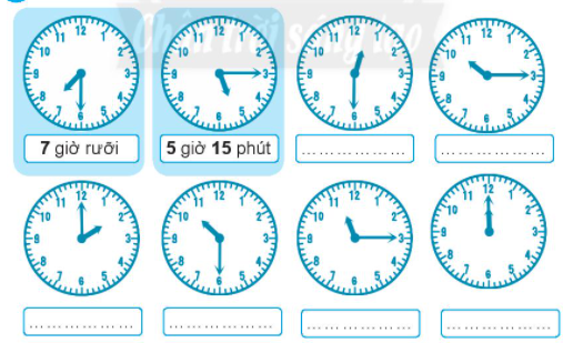Quan sát tranh rồi viết thời gian tương ứng trên mỗi đồng hồ theo ví dụ mẫu.