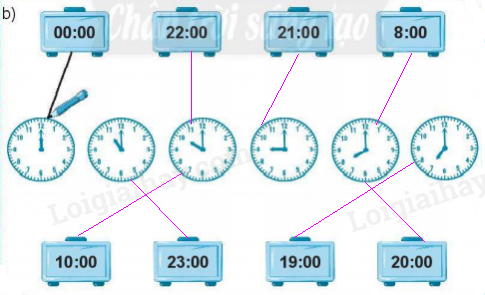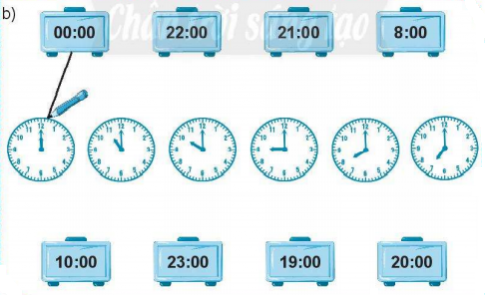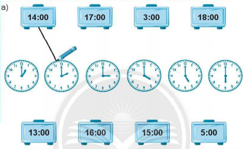 Xem giờ trên mỗi đồng hồ rồi nối với số ghi thời gian tương ứng.