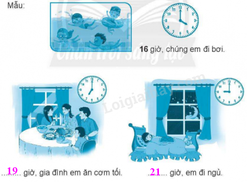 Xem đồng hồ rồi viết thời gian thích hợp chỗ mỗi hoạt động.