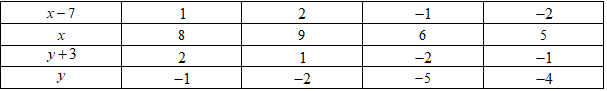 Vậy các cặp số \((x,y)\) là \(\left\{ {\left( {8; – 1} \right);\left( {9; – 2} \right);\left( {6; – 5} \right);\left( { – 5; – 4} \right)} \right\}\)