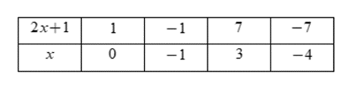 Do đó \(2x + 1 \in Ư\left( 7 \right) = \left\{ { \pm 1; \pm 7} \right\}\)