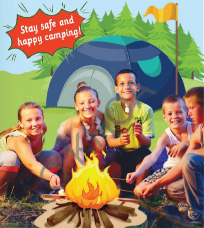 They are at a campsite. To stay safe at a campsite I have to pack my food in tightly closed containers and keep it in the cool box, attend the fire all the time ( 5:00 p.m. – 10p.m.) and make sure you put it out with water, take pets on a leash along, stay away from wild animals, bring my own first aid kit, and keep the campsite clean and tidy.