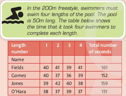 Bảng dưới đây cho thấy thời gian mà bốn vận động viên bơi lội để hoàn thành mỗi chiều dài.