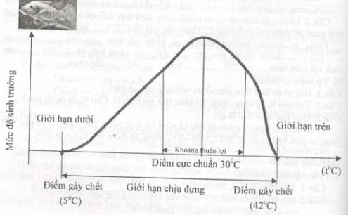 Vẽ sơ đồ giới hạn về nhiệt độ của cá rô phi ở việt nam. Biết rằng cá rô phi Việt Nam có giới hạn nhiệt độ từ 5°C đến 42°C, trong đó điểm cực thuận là 30°C