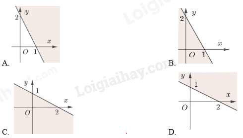 Ta thấy điểm O (0; 0) không thuộc đường thẳng \(d:2x + y – 2 = 0\) và \(2.0 + 0 < 2\) nên miền nghiệm của bất phương trình \(2x + y > 2\) là nửa mặt phẳng (không kể bờ d) không chứa điểm O.