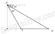 Xét tam giác CMA vuông tại C có: \(MA = \frac{{MC}}{{\cos \widehat {CMA}}} = \frac{9}{{\cos {{30}^0}}} = 6\sqrt 3 \left( m \right)\)