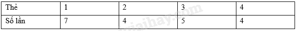 Trong hộp có 4 thẻ đánh số 1; 2; 3; 4. Hoa lấy ngẫu nhiên một thẻ từ hộp, ghi số lại rồi trả lại hộp. Lặp lại hoạt động trên 20 lần, Hoa được kết quả như sau: