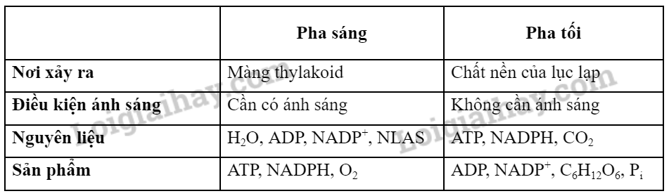 Câu 1. Hãy phân biệt pha sáng và pha tối của quang hợp về: nơi diễn ra, điều kiện ánh sáng, nguyên liệu tham gia và sản phẩm.