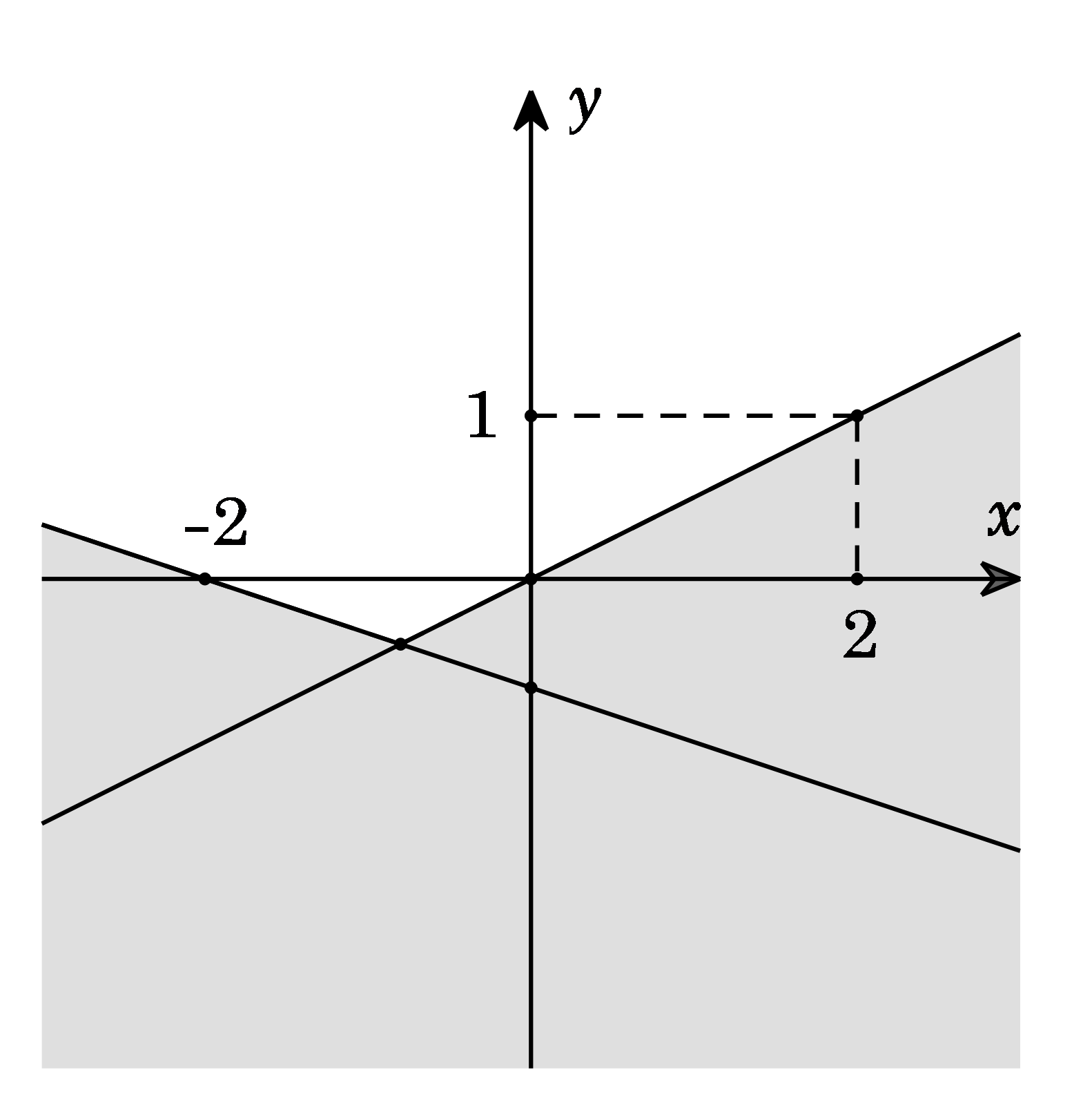 A. \(\left\{ \begin{array}{l}x – 2y \le 0\\x + 3y \ge – 2\end{array} \right..\) B. \(\left\{ \begin{array}{l}x – 2y > 0\\x + 3y < – 2\end{array} \right..\) C. \(\left\{ \begin{array}{l}x – 2y \le 0\\x + 3y \le – 2\end{array} \right..\) D. \(\left\{ \begin{array}{l}x – 2y < 0\\x + 3y > – 2\end{array} \right..\)
