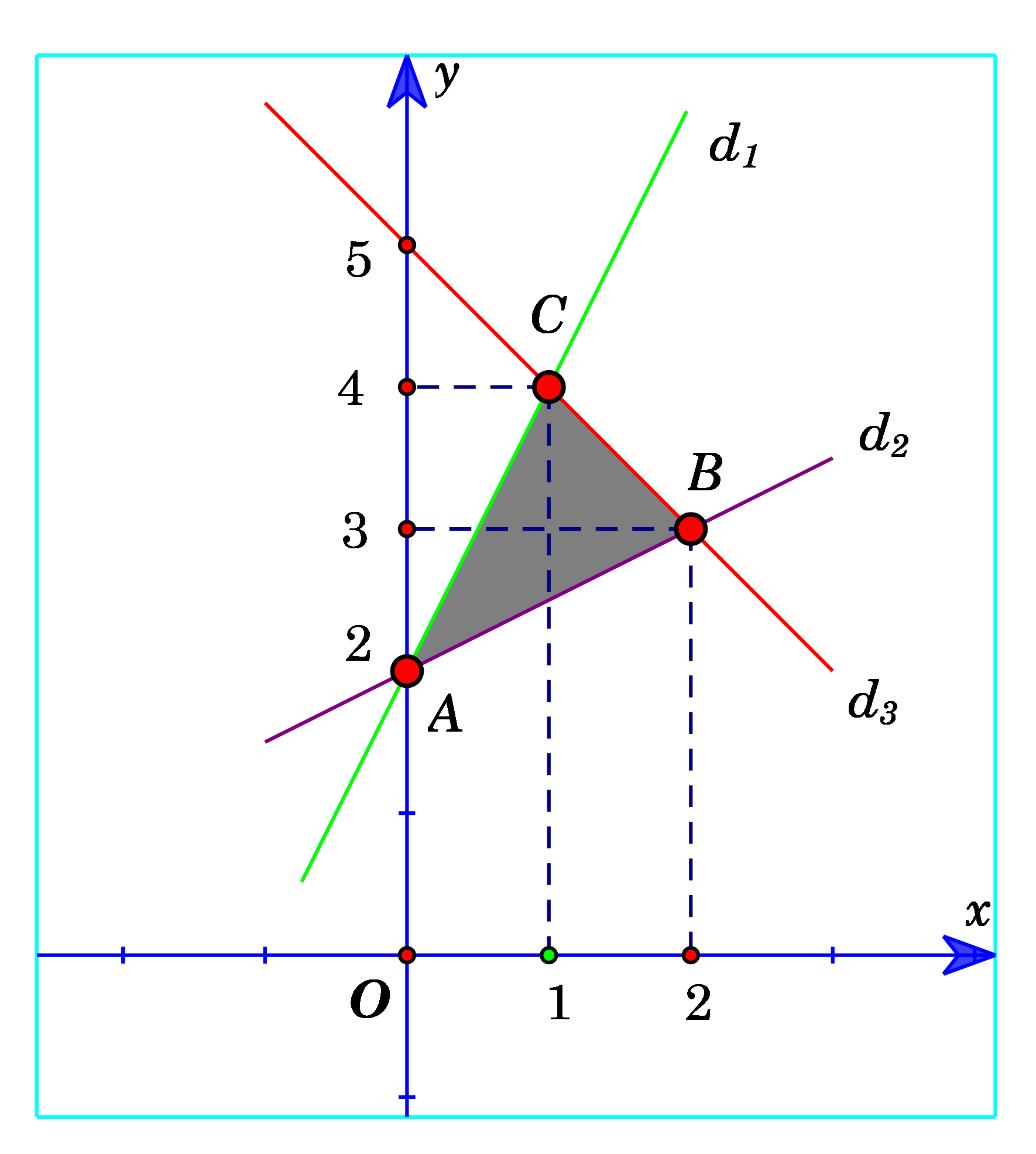 \(\begin{array}{l}{d_1}:y – 2x – 2 = 0,\,\,{\rm{ }}{d_2}:2y – x – 4 = 0,{\rm{ }}\\{\rm{ }}{d_3}:x + y – 5 = 0.\end{array}\)