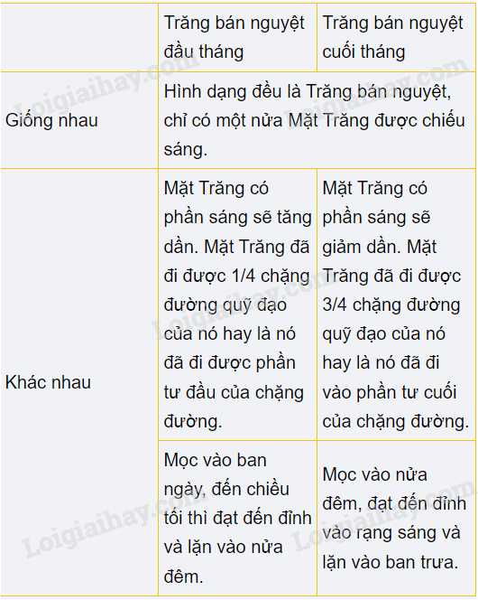 | Chỉ ra sự giống nhau và khác nhau giữa Trăng bán nguyệt đầu tháng và Trăng bán nguyệt cuối tháng. |