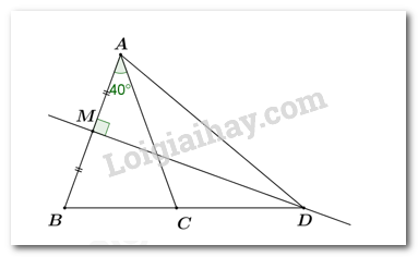Tam giác ABC cân tại A nên \(\angle MBD = \angle ACB = \dfrac{{{{180}^0} – \angle BAC}}{2} = \dfrac{{{{180}^0} – {{40}^0}}}{2} = {70^0}\)