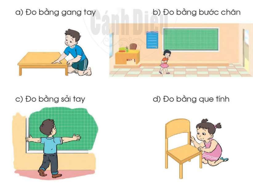 a) Mặt bàn dài khoảng 9 gang tay.                    b) Lớp em rộng khoảng 25 bước chân.