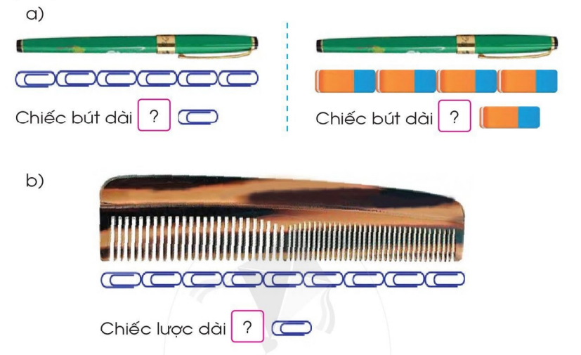 c) Bảng lớp dài khoảng 3 sải tay.                      d) Chiếc ghế cao khoảng 8 que tính.