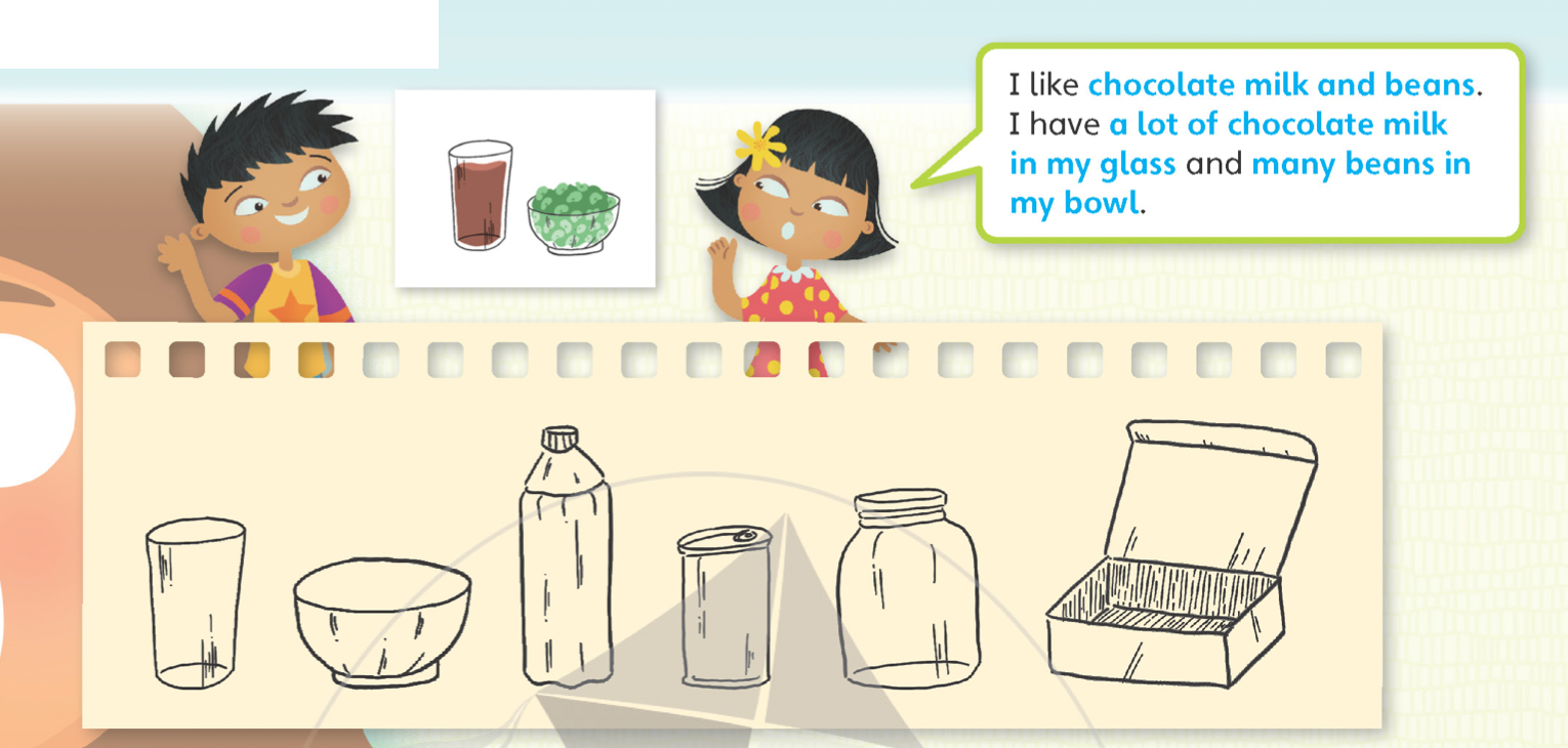 (Tôi có rất nhiều sô cô la sữa trong ly và nhiều đậu trong bát.)