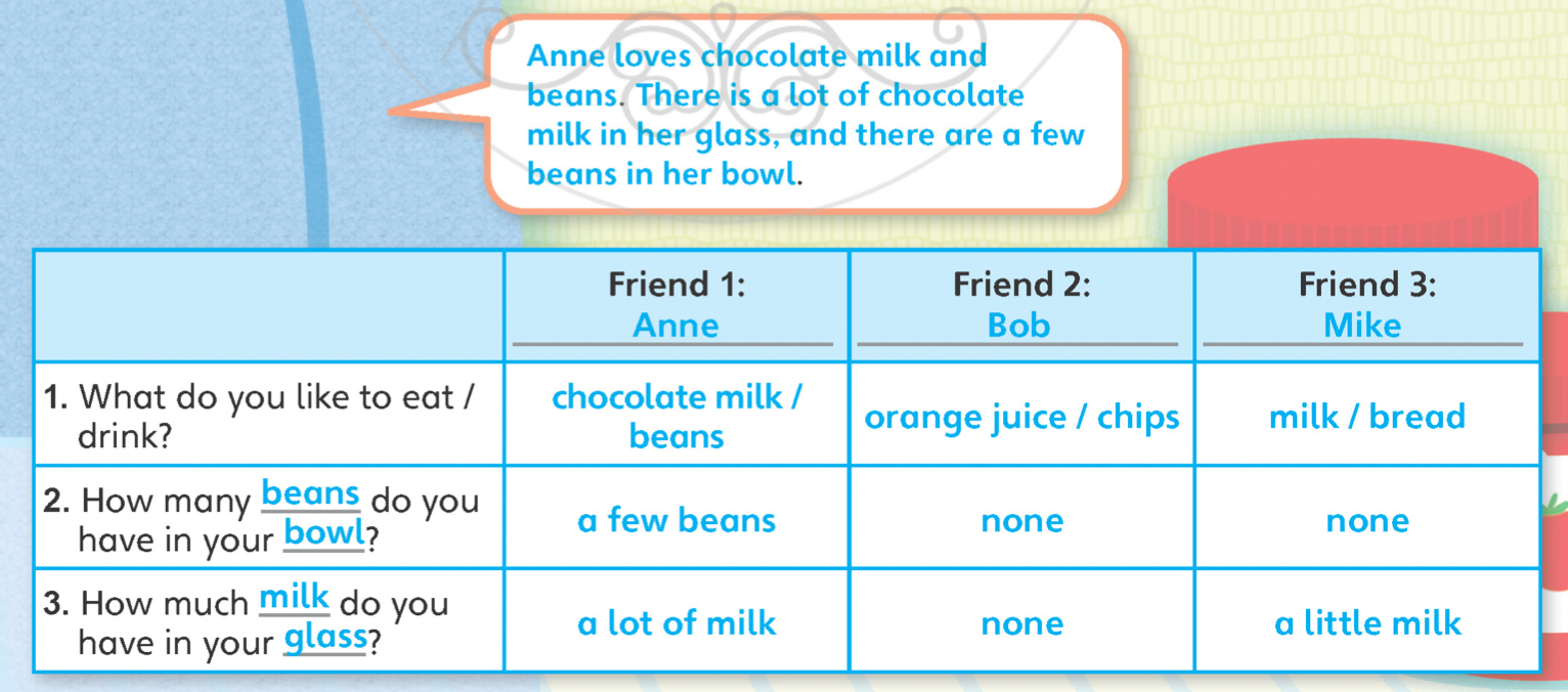 (Anne thích sữa sô cô la và đậu. Có rất nhiều sô cô la sữa trong ly của cô ấy và có một ít đậu trong bát của cô ấy.)