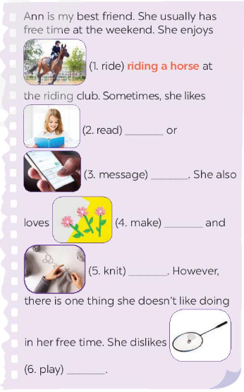 Ann is my best friend. She usually has free time at the weekend. She enjoys (1. ride) riding a horse at the riding club. Sometimes, she likes (2. read) _____ or (3. message) _____. She also loves (4. make) _____ and (5. knit) _____. However, there is one thing she doesn’t like doing in her free time. She dislikes (6. play) _____.