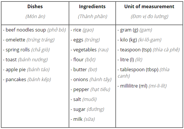(Thêm các từ và cụm từ bạn đã học vào các cột chính xác.)