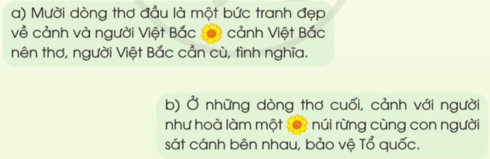 Bài thơ là lời của ai nói với ai. Chọn ý đúng. Tìm những hình ảnh đẹp về núi rừng Việt Bắc trong bài thơ. Tìm những hình ảnh đẹp về người dân Việt Bắc cần cù lao động. Những câu thơ nào nói lên lòng yêu nước của người dân Việt Bắc. Có thể thay bông hoa trong mỗi câu dưới đây bằng dấu câu nào? Dấu câu ấy được dùng làm gì. Dựa theo nội dung bài đọc, em hãy viết tiếp vào vở câu dưới đây, trong câu có sử dụng dấu hai chấm.