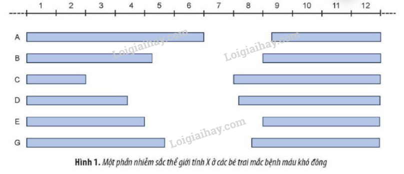Ở người, bệnh máu khó đông do đột biến gene lặn nằm trên nhiễm sắc thể giới tính X dẫn đến thiếu hụt yếu tố antihemophilic A và antihemophilic B tham gia vào quá trình đông máu nên không thể hình thành cục máu đông. Khi phân tích tế bào của sáu bé trai (kí hiệu từ A đến G) mắc bệnh máu khó đông, người ta thấy trên nhiễm sắc thể X của những bé trai này đều bị đột biến mất một đoạn nhỏ thuộc các vùng khác nhau (kí hiệu từ 1 đến 12) (Hình 1).
