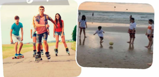 In picture A, a group of teenagers is enjoying rollerblading outdoors, showcasing an active and dynamic hobby. Picture B, on the other hand, depicts a group of children playing ball on the beach, highlighting a more relaxed and playful activity.