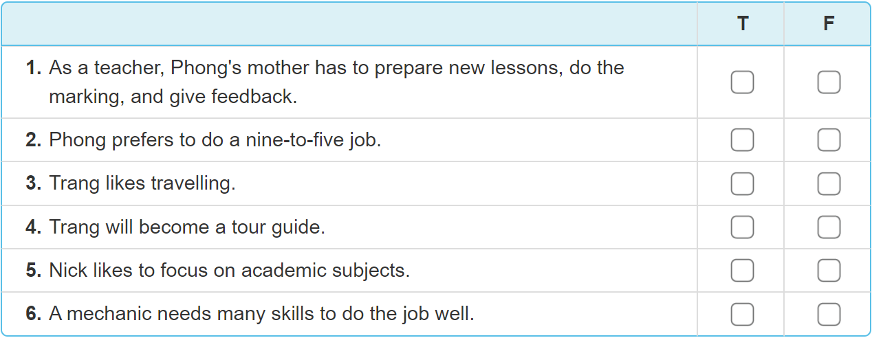 (Nghe lại và quyết định những câu sau là đúng (T) hay sai (F).)