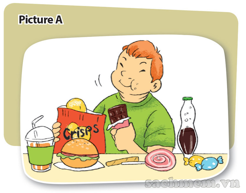 Picture A: A boy is eating chocolate. On the table there are junk foods such as crisps, a hamburger, soft drinks, and sweets. The boy looks fat.