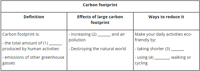 1. Listen and complete the conversation with the expressions in the box. Then practise it in pairs. 2. Work in pairs. Make similar conversations asking for and giving advice about green living. Use the expressions below to help you. 1. Read the text and complete the table. 2. Work in pairs. Discuss things you can do to reduce your carbon footprint.