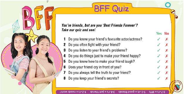 1 Are you a good friend? Take the quiz to find out. 2 It’s International Friendship Day. Find a good quote and prepare a poster for the class. Use the key words friendship quotes. 3 What makes a good friend? Put the ideas in the list under the headings. Add two more of your own. 4 Use the ideas in Exercise 3 to prepare and give a presentation on how to be a good friend. 5 “A friend in need is a friend indeed.” Discuss in groups.