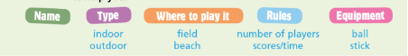 Where to play it: field/ beach (địa điểm: sân chơi/ bãi biển.)