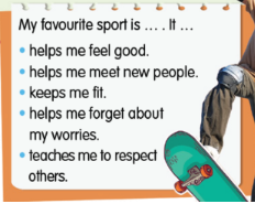 My favourite sport is skating. It helps me keep me fit and helps me meet new people. At the same time, playing sport improves my health. ( Môn thể thao yêu thích của tôi là trượt băng. Nó giúp tôi giữ dáng và giúp tôi gặp được nhiều bạn mới hơn. Đồng thời, chơi thể thao cũng giúp cải thiện sức khỏe.)