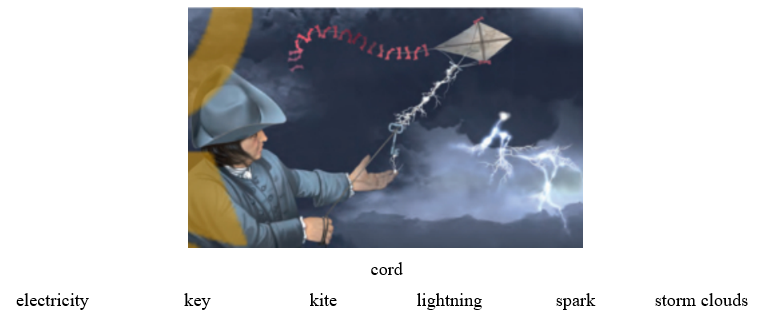 4 SPEAKING Describe the picture using the words below. Have you heard of this experiment? What do you think Franklin was trying to discover?