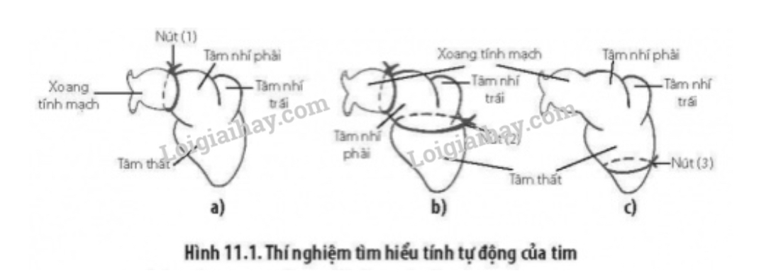 Để chứng minh tính tự động của tim ếch, người ta dùng chỉ thắt ba nút ở các vị trí khác nhau của tim như Hình 11.1.