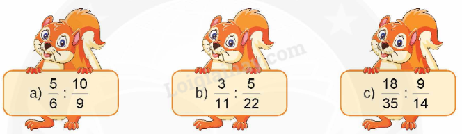 c) $\frac{{18}}{{35}}:\frac{9}{{14}} = \frac{{18}}{{35}} \times \frac{{14}}{9} = \frac{4}{5}$
