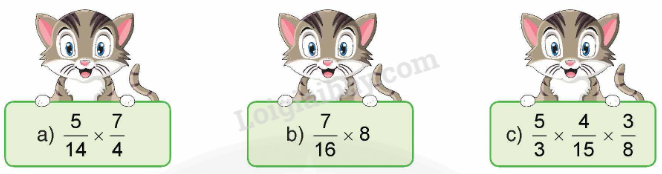 a) $\frac{5}{{14}} \times \frac{7}{4} = \frac{{35}}{{56}}$
