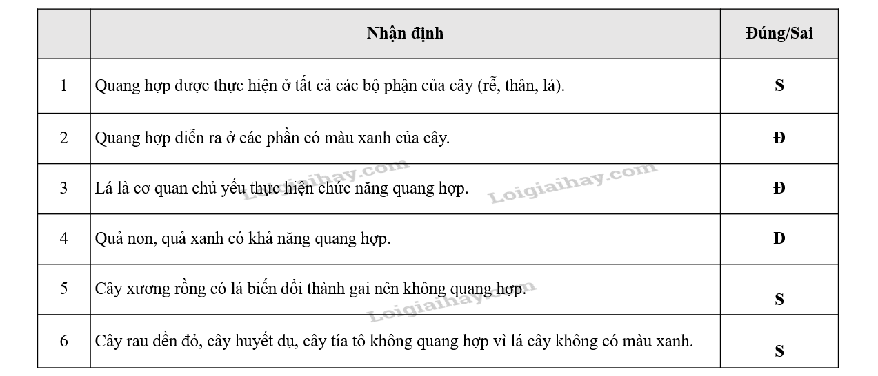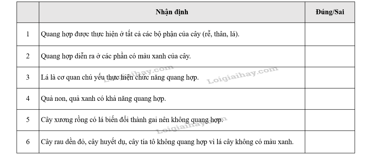Xác định tính đúng, sai của các nhận định trong bảng sau bằng cách ghi từ Đúng hoặc Sai vào ô bên cạnh.