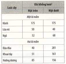 Bảng số liệu dưới đây cho thấy sự phân bố của khí khổng ở hai mặt của lá cây.