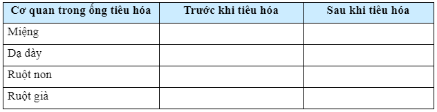 Dựa vào những hiểu biết của em về sự biến đổi thức ăn trong ống tiêu hóa của người, hãy hoàn thành bảng theo mẫu sau và rút ra nhận xét về sự phối hợp hoạt động của các cơ quan trong ống tiêu hóa.