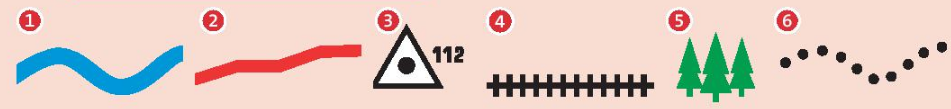 Có một số biểu tượng trong chú thích. Một khu vực có cây xanh là rừng, và đường màu xanh là sông. Một đường chấm đen là một tuyến đường. Có một hình tam giác nhỏ màu đen và một con số cho một ngọn đồi. Con số – ví dụ 112 – có nghĩa là ngọn đồi cao 112 mét. Đường màu đỏ là con đường và đường sắt là đường màu đen với các đường nhỏ hơn trên đó. Một vòng tròn màu đen trên đường sắt là một nhà ga xe lửa. Khu vực màu đỏ là thành phố hoặc thị trấn. Bên cạnh khu vực màu đỏ là tên của thành phố.