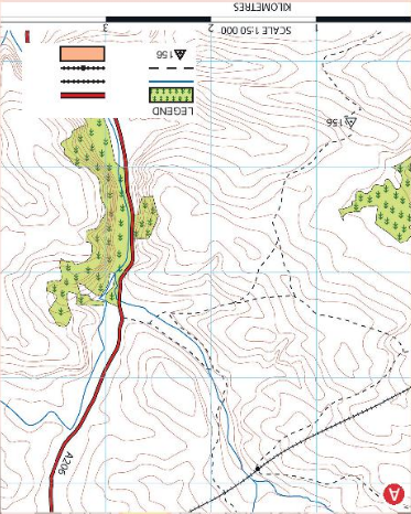 (Tỷ lệ là 1: 50.000. Có rất nhiều con đường trên bản đồ này, và có một ngọn đồi. Ngọn đồi cao 156 mét. Ngoài ra còn có một con đường lớn và một nhà ga xe lửa trên bản đồ.)