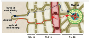 Hình ảnh mô tả con đường hấp thụ, vận chuyển nước và muối khoáng ở rễ: Nước và muối khoáng từ đất được lông hút của rễ hấp thụ và đưa vào mạch gỗ để vận chuyển lên thân và lá.