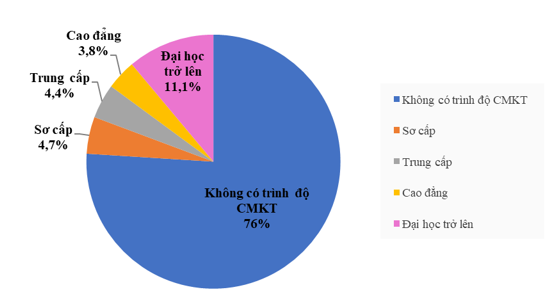 Từ biểu đồ hình quạt tròn, ta thấy 76% lực lượng lao động không có trình độ CMKT; 11,1% lực lượng lao động có trình độ đại học trở lên.